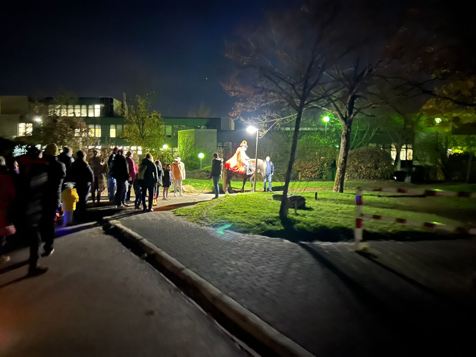 Schon beim Eintreffen leuchteten die selbstgebastelten Laternen in allen Farben, und das ganze Gelände strahlte in einem besonderen Glanz. Die Kinder sangen mit Begeisterung die bekannten Martinslieder, begleitet vom warmen Schein der Lichter, einer Blaskapelle und den erwartungsvollen Blicken auf das Highlight des Abends: Sankt Martin auf seinem echten Pferd.
