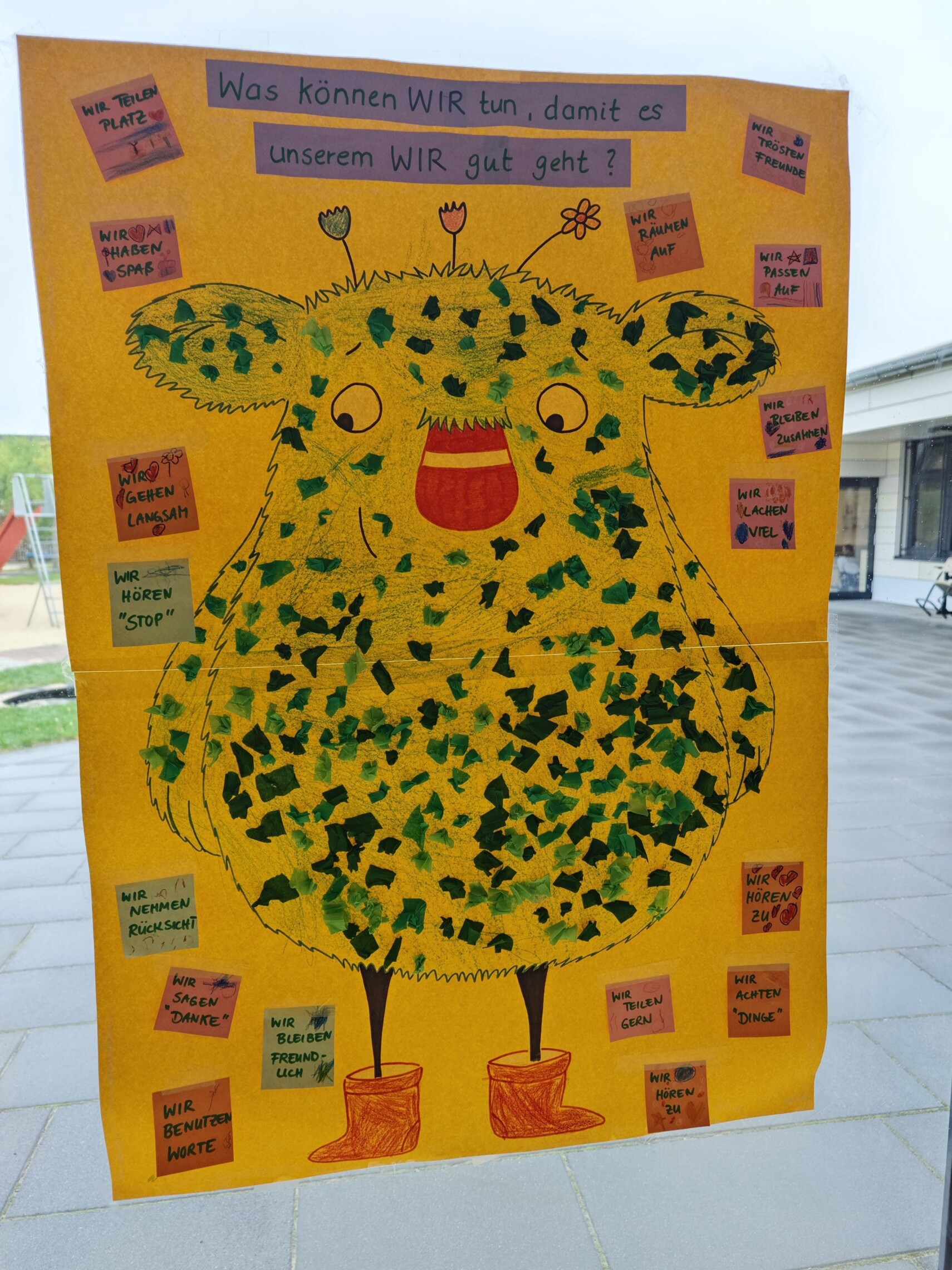 - Bildkünstlerisches Gestalten: Die Kinder gestalten ein großes Plakat mit dem kleinen WIR – bunt, individuell und gemeinsam.