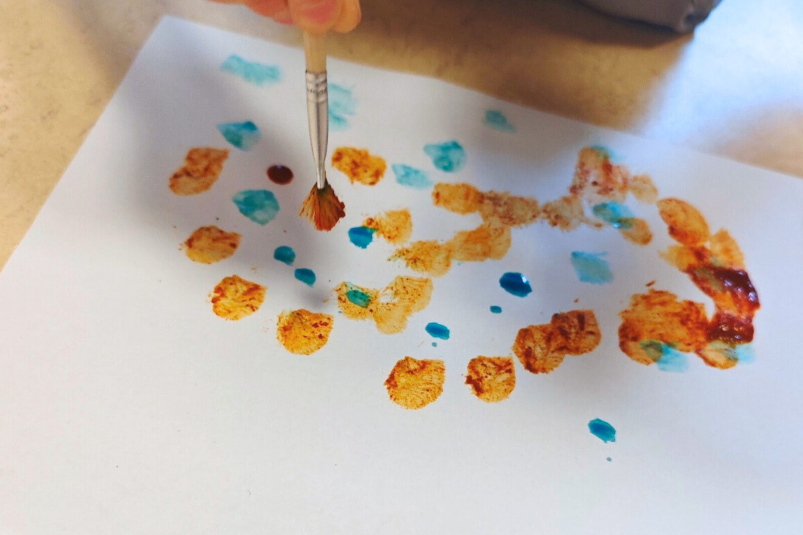 Im praktischen Teil stellten die Kinder aus den Gewürzen eigene Farben her. Durch das Vermischen mit Wasser entstanden natürliche Farbtöne, mit denen die Kinder Bilder gestalteten. Anschließend wurden Buchstaben aus den duftenden Bildern geschnitten, sodass eine Verbindung zwischen Kreativität, Sinneserfahrung und früherer Schriftkultur entstand. Zusätzlich wurden kleine Riechproben erstellt, um Gerüche wiederzuerkennen und zuzuordnen.