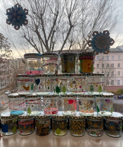 Jedes Kind durfte ein eigenes Komplimente-Glas gestalten, sorgfältig dekoriert, mit funkelnden Stickern, glitzernden Schneeflocken, Weihnachtsbäumen, bunten Perlen und jeder Menge Fantasie. In diesen Gläsern, die wie kleine Schatztruhen im Fensterlicht erstrahlen, sammeln sich Tag für Tag persönliche Worte, die von Herzen kommen.
