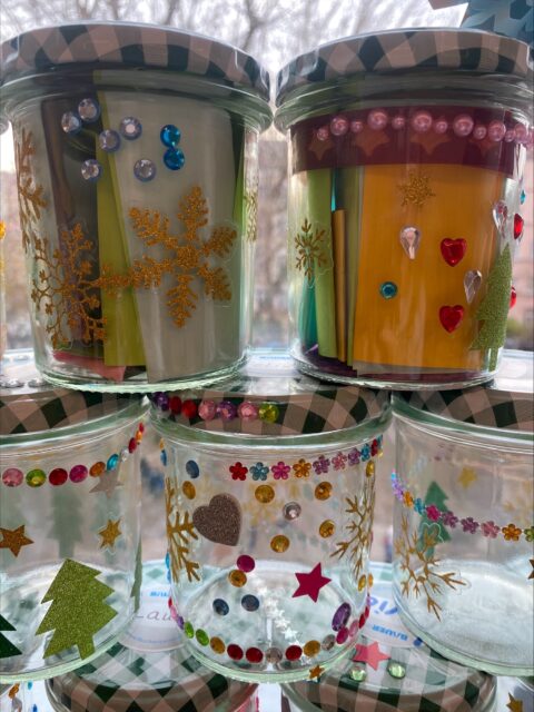 Jedes Kind durfte ein eigenes Komplimente-Glas gestalten, sorgfältig dekoriert, mit funkelnden Stickern, glitzernden Schneeflocken, Weihnachtsbäumen, bunten Perlen und jeder Menge Fantasie. In diesen Gläsern, die wie kleine Schatztruhen im Fensterlicht erstrahlen, sammeln sich Tag für Tag persönliche Worte, die von Herzen kommen.