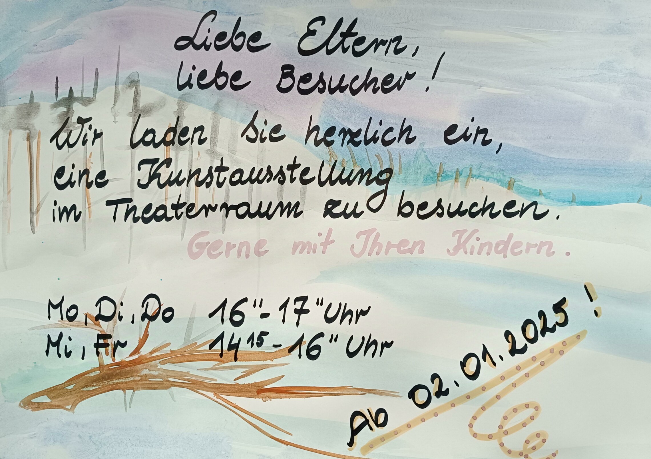 das neue Jahr beginnt bei uns an der dreieins Grundschule Berlin-Pankow mit einer ganz besonderen Einladung: Wir freuen uns, Sie ab dem 2. Januar 2025 zu unserer Kunstausstellung im Theaterraum zu begrüßen!