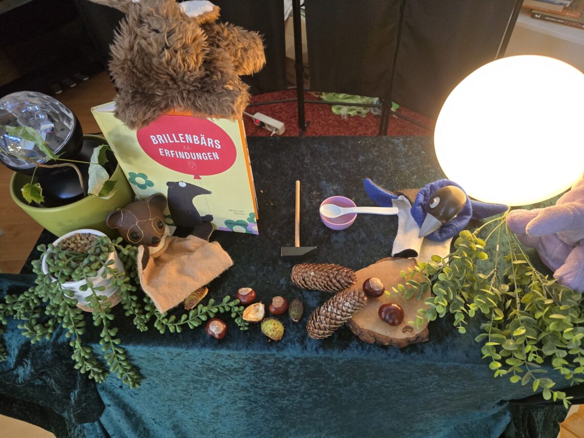 Unsere Theaterpädagogin in der Kita präsentiert die Geschichte vom Brillenbär mit Handpuppen und Figuren für die Kinder. Hierbei wird das Buch frei erzählt und die Geschichte interaktiv gestaltet. Die Kinder helfen dem Brillenbär bei der Planung neuer Erfindungen und entwickeln selbst Ideen für neue Erfindungen.