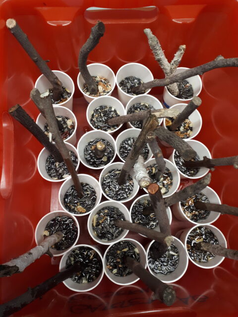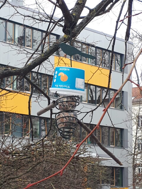 Anschließend wurden die Futterspiralen gemeinsam in die Bäume auf dem Schulhof gehängt. Schon kurze Zeit später konnten wir erste Vögel beobachten, die die neuen Futterstellen neugierig inspizierten.