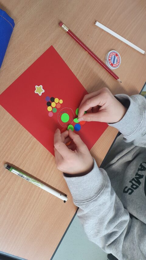 In der 5. Klasse arbeiteten die Kinder in Kleingruppen an der Weihnachtsdekoration für die Bühne. Hier standen Zusammenarbeit, Planung und gemeinsames Entscheiden im Mittelpunkt – Kompetenzen, die weit über das Basteln hinausreichen.